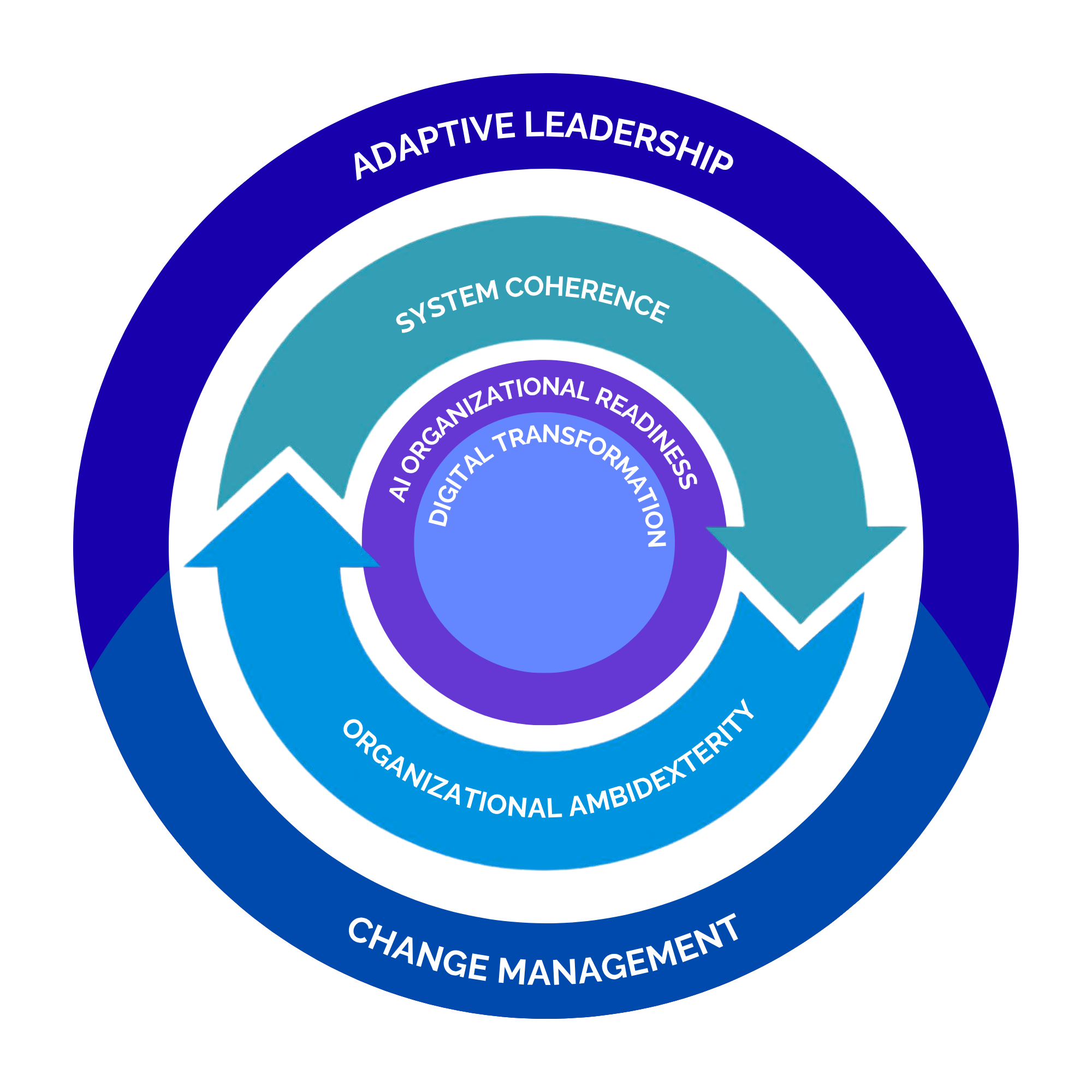 Adaptive leaders catalyze change management by establishing coherence to foster ambidexterity, enabling digital transformation through AI organizational readiness.